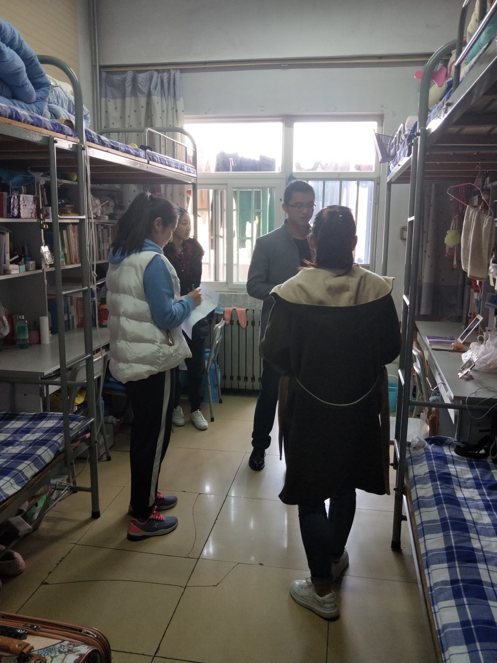 本次检查重点为用电安全、大功率电器、危险物品、防水、防盗以及宿舍卫生等方面,对发现的问题现场提出并予以整改。经过将近一个多小时的精心检查,发现各宿舍卫生状况普遍良好,基本做到了被褥衣物叠放整齐,地面、桌面干净整洁,用电合理、安全。仍有个别宿舍存在卫生不达标、空气质量较差、电线随意拉扯等问题,检查组及时进行了批评指正,进行现场整改。