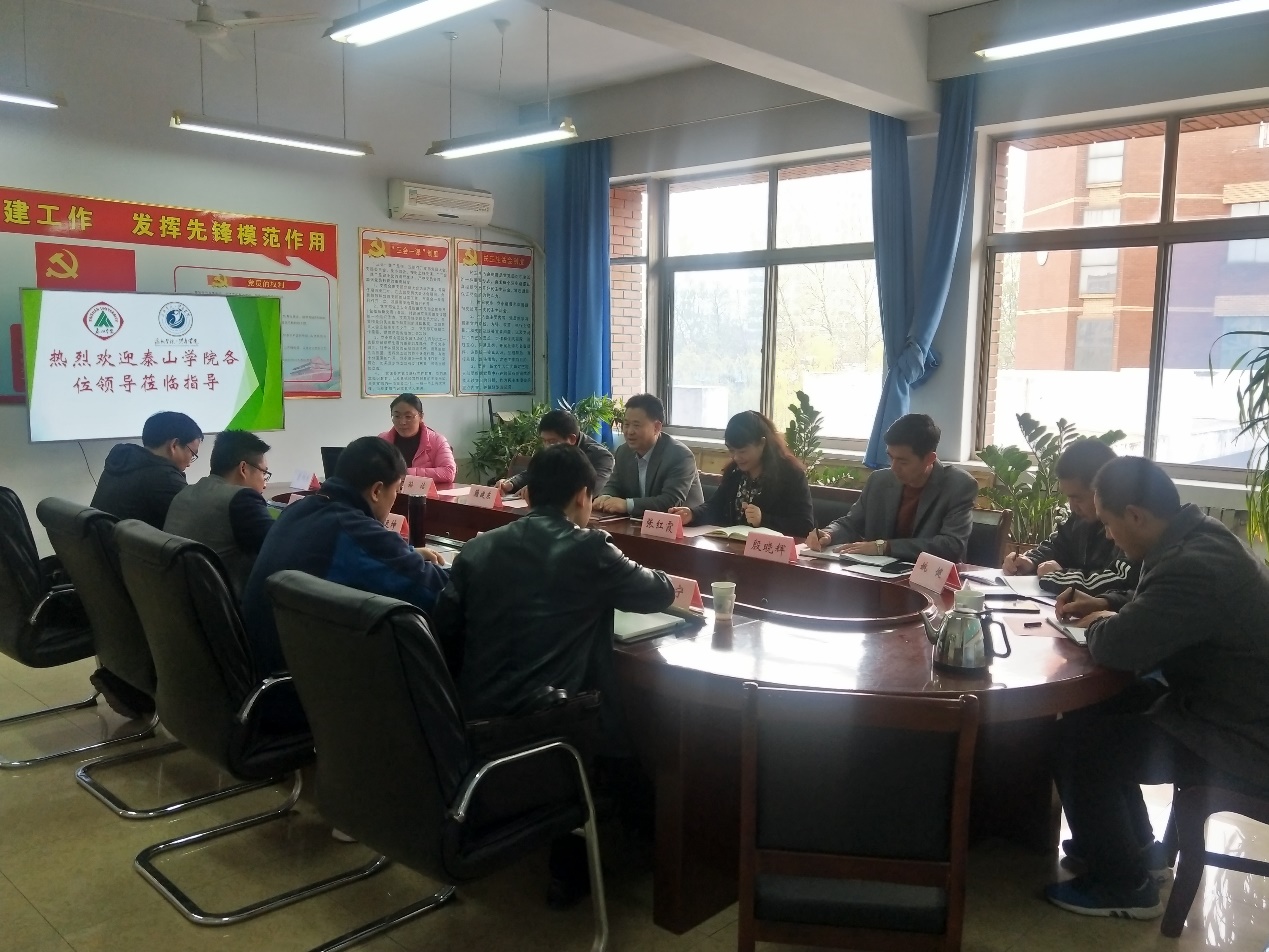 副院长张红霞根据去年审核评估中的工作情况,详细的介绍给泰山学院,从突出亮点与特色等方面介绍了我院在本科教学工作审核评估中的经验和做法。太阳成集团122ccvip殷晓辉、籍建东、姚健、孙洁、董锦秀老师在本科教学评估中对所负责部分,详细介绍具体思路和做法。双方就本科教学工作审核评估相关事宜进行了对**流。