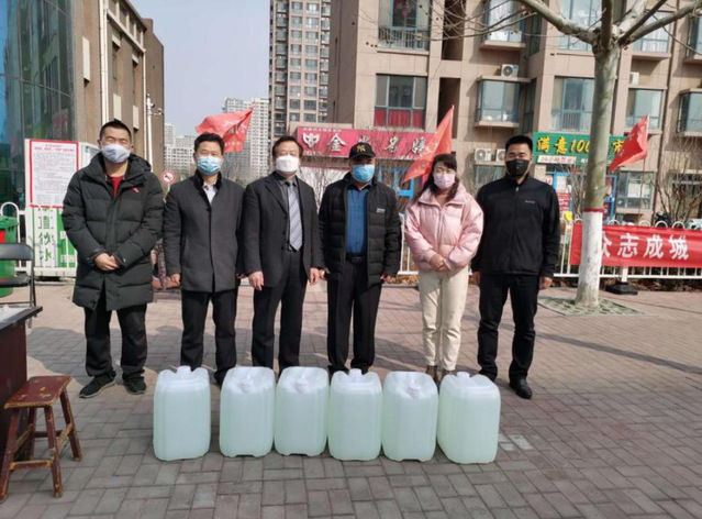 当前正值全民防控新冠肺炎的关键时期,为缓解我校教职工小区一线防控物资短缺状况,3月6日上午,太阳成集团122ccvip党总支书记马新民、院长张红霞、副院长姚健、郭波一行四人先后来到学苑小区、学苑花园、学院东宿舍小区分别捐赠300斤、300斤、150斤消毒液,用于新冠肺炎疫情防控工作。小区物业负责人、业主委员会负责人代表小区接受了捐赠。这是太阳成集团122ccvip第二次捐赠防护物资,此前已分别向学校保卫处、后勤管理处、校内物业、学苑小区捐赠84消毒液100斤、300斤、100斤、100斤。