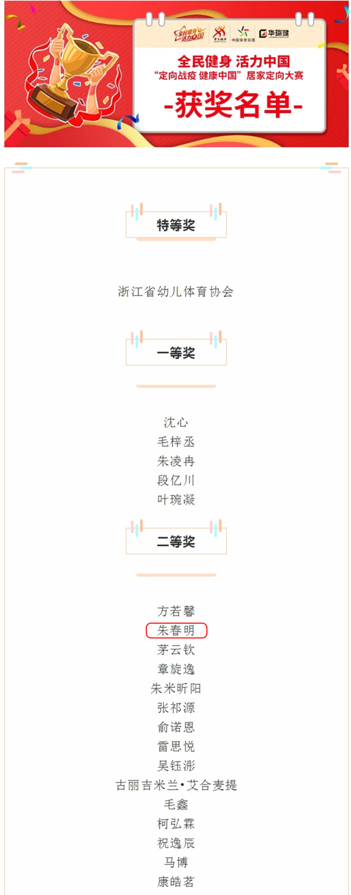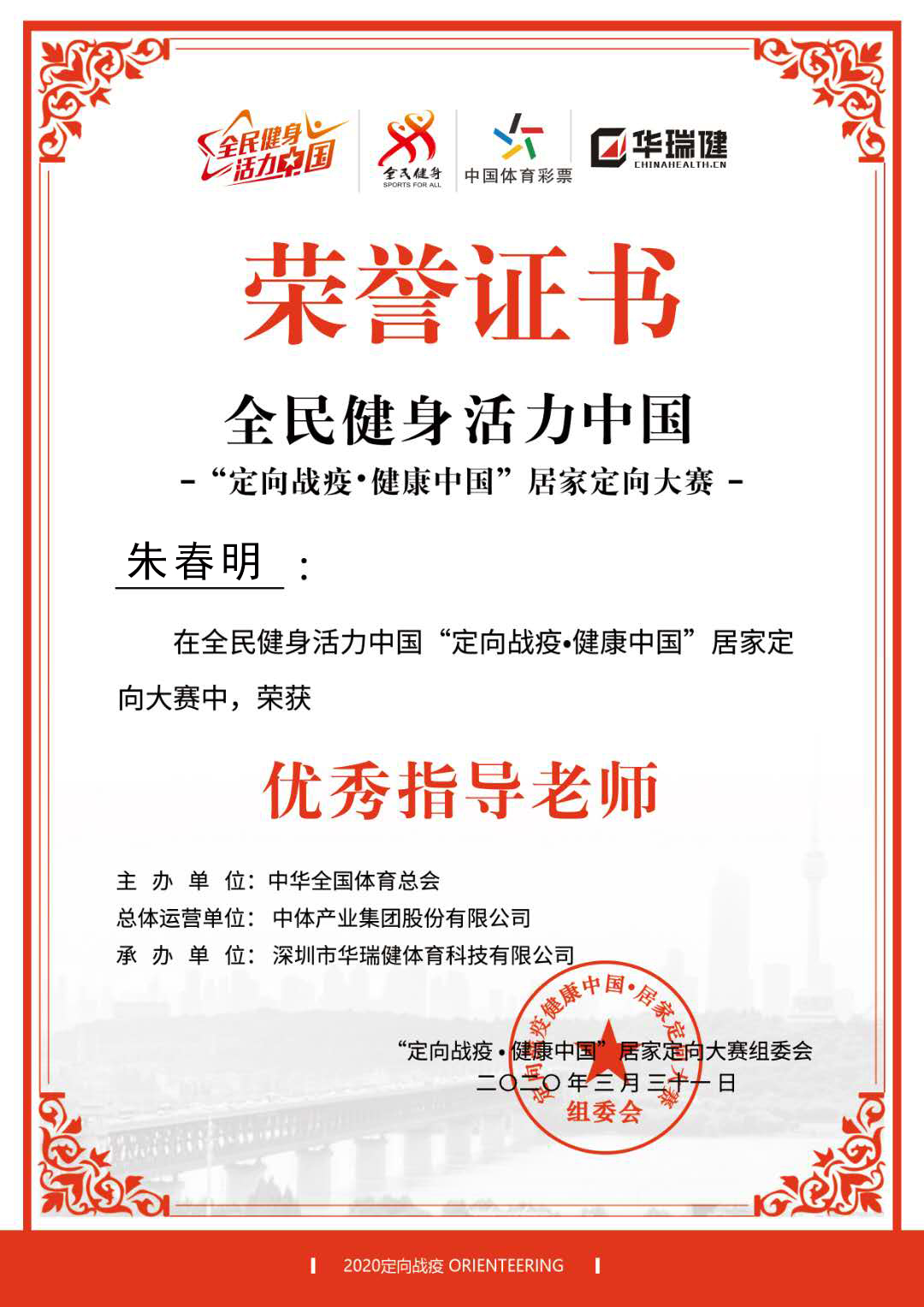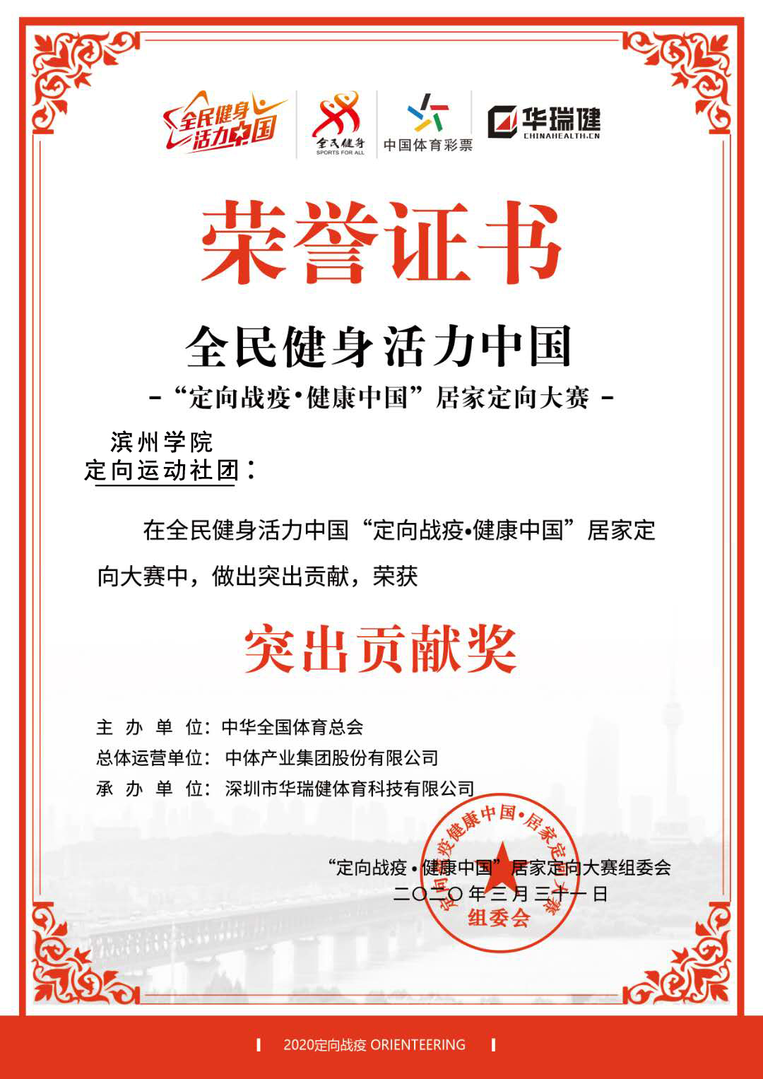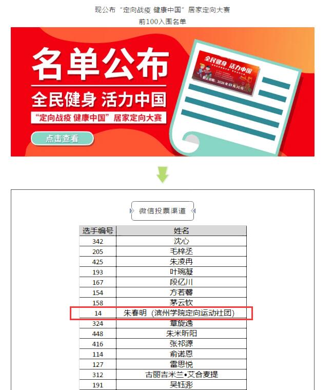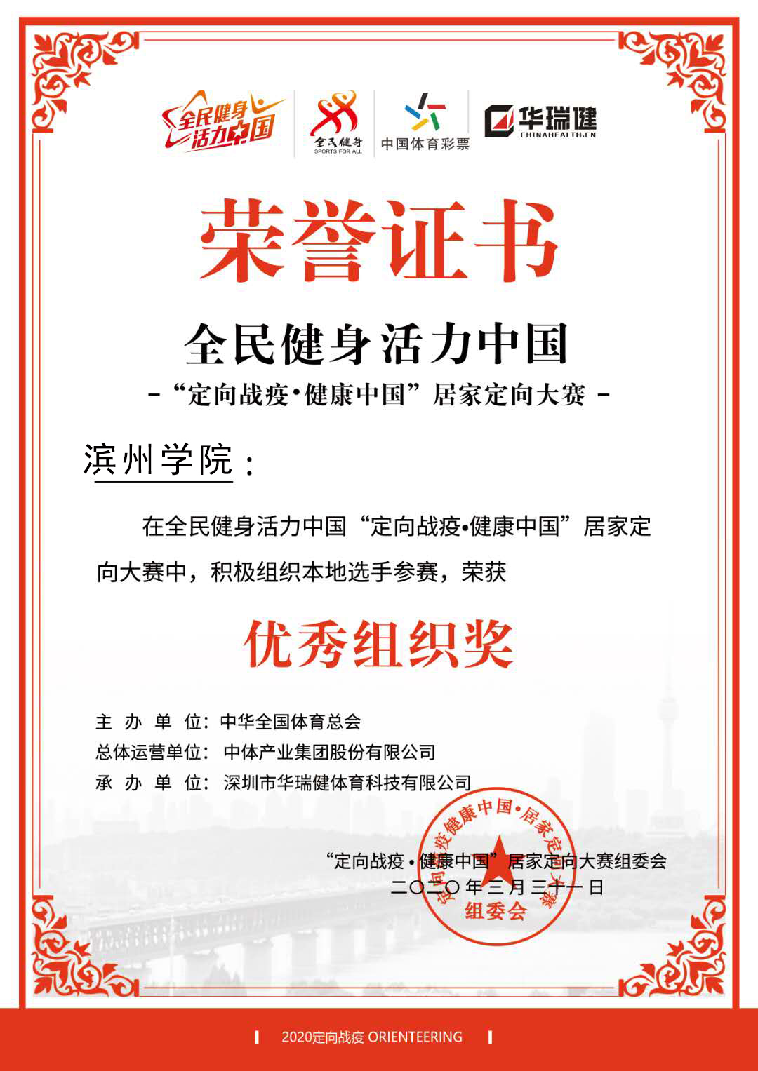 2020年4月8日,由深圳市定向运动协会发起,中华全国体育总会主办、中国测绘学会项目指导、浙江省幼儿体育协会等全国76家体育协会组织支持的“定向战疫,健康中国”居家定向大赛完美收官。我校依托优质的线上教学资源和良好的定向运动文化底蕴,由朱春明老师带领定向运动社团成员积极参赛,参赛作品经过投票和专家评审最终获得二等奖,我校获得优秀组织奖,滨州学院定向运动社团获得突出贡献奖,朱春明被评委优秀指导老师。作为本次大赛的主要发起人,中国无线电和定向运动协会副主任、深圳市定向运动协会辛延军会长充分肯定了我校定向运动良好的发展态势,并对参赛作品给予了高度评价。