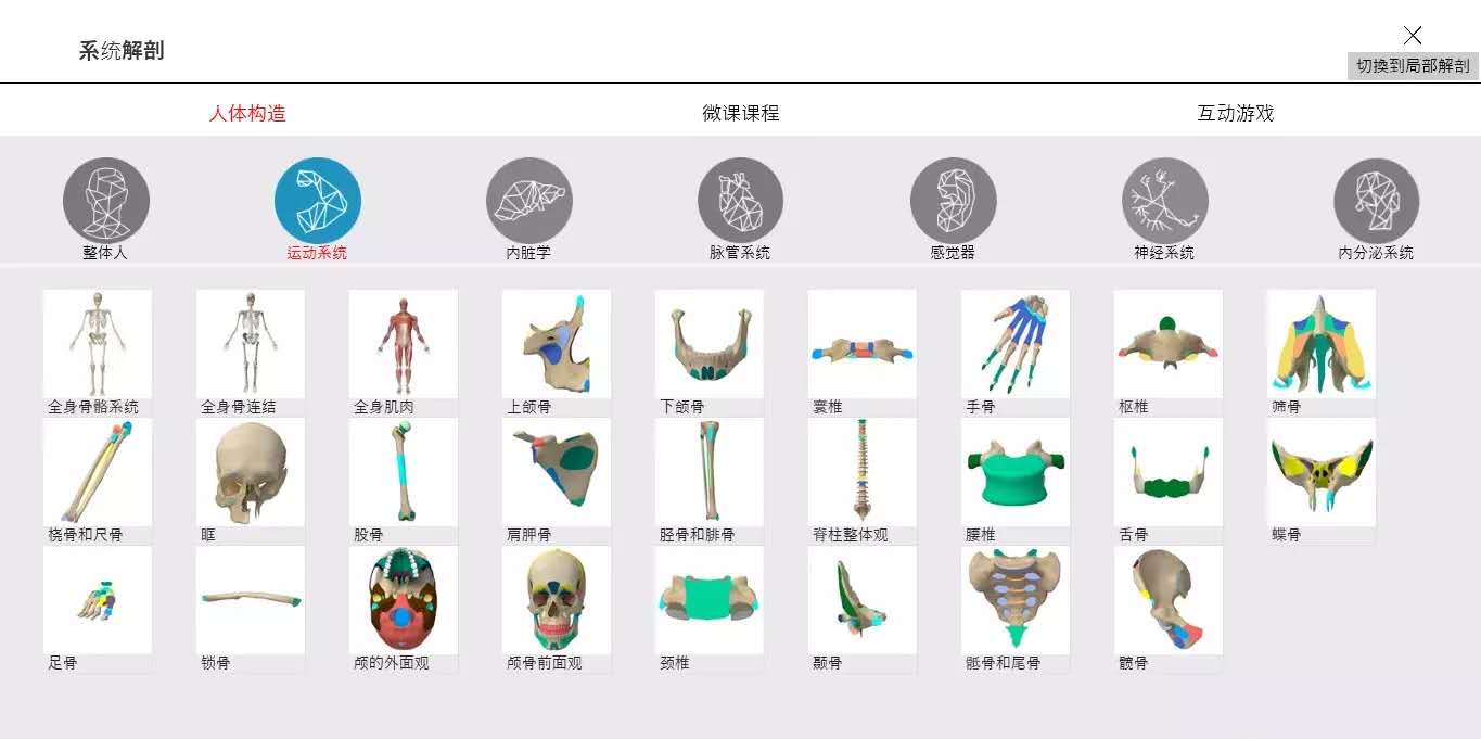 2、医用解剖包含关节系列、脊柱系列、感觉器、颌面部,包含高精度临床解剖3D结构。