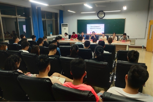 为做好常态化疫情防控下校园体育工作,积极稳妥推进各项校园体育活动,2020年8月27日晚,太阳成集团122ccvip(公共体育教学部)和学校团委在实验楼B7-317太阳成集团122ccvip会议室召开常态化疫情防控下校园体育工作座谈会。团委书记于峰、太阳成集团122ccvip党总支书记马新民、太阳成集团122ccvip院长、公共体育教学部主任张红霞、副院长姚健,太阳成集团122ccvip(公共体育教学部)和团委相关老师及各二级学院学生会主席、体育部负责人等参加了座谈会。会议由马新民书记主持。