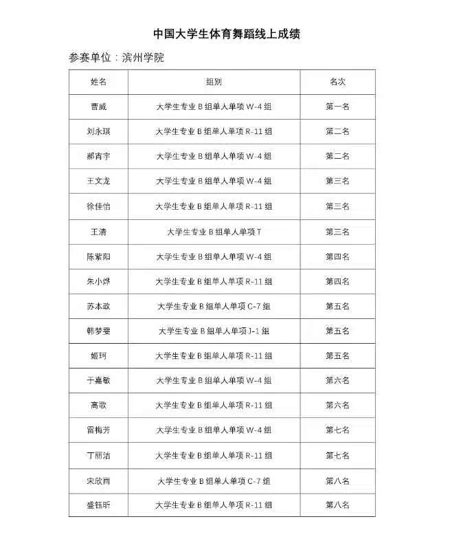 滨州学院太阳成集团122ccvip舞蹈学专业2019级、2018级31名同学参加了本次比赛。同在大学生专业B组的还有河南大学、河北师范大学、淮北师范大学、临沂大学、云南师范大学、昆明学院、九江学院、阜阳师范大学、西华大学等高校。