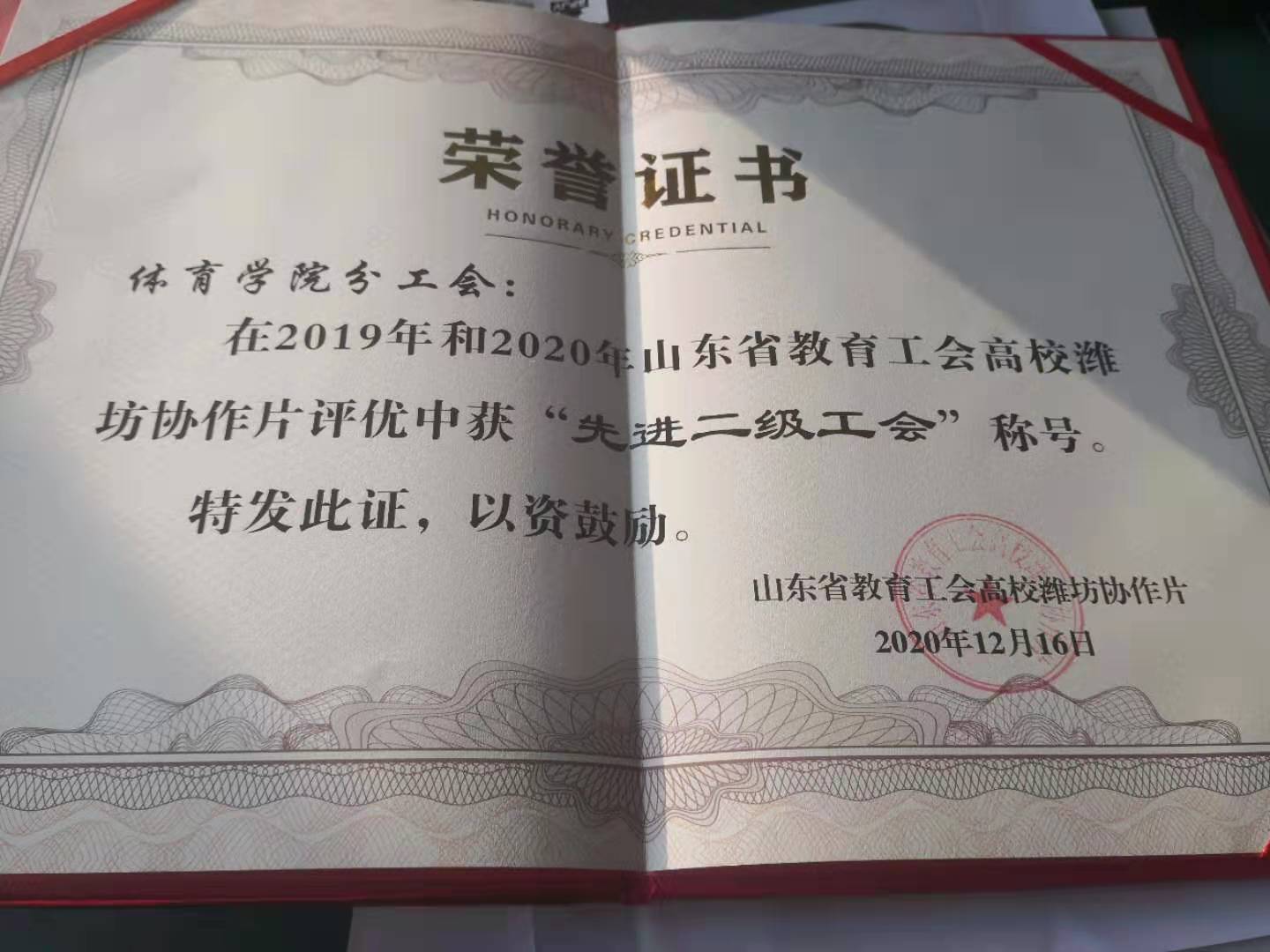 近日,山东省教育工会高校潍坊协作片对高校先进二级工会进行了评选表彰,太阳成集团122ccvip分工会获2019年和2020年高校潍坊协作片“先进二级工会”称号。