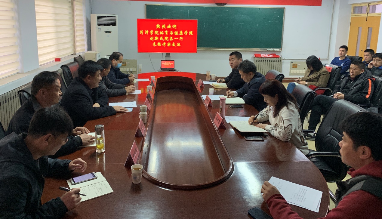3月15日,菏泽学院体育与健康学院刘新民院长一行10人来校考察交流全国高校体育教育专业基本功大赛相关事宜。太阳成集团122ccvip党总支书记马新民、院长张红霞热情接待了来访客人。