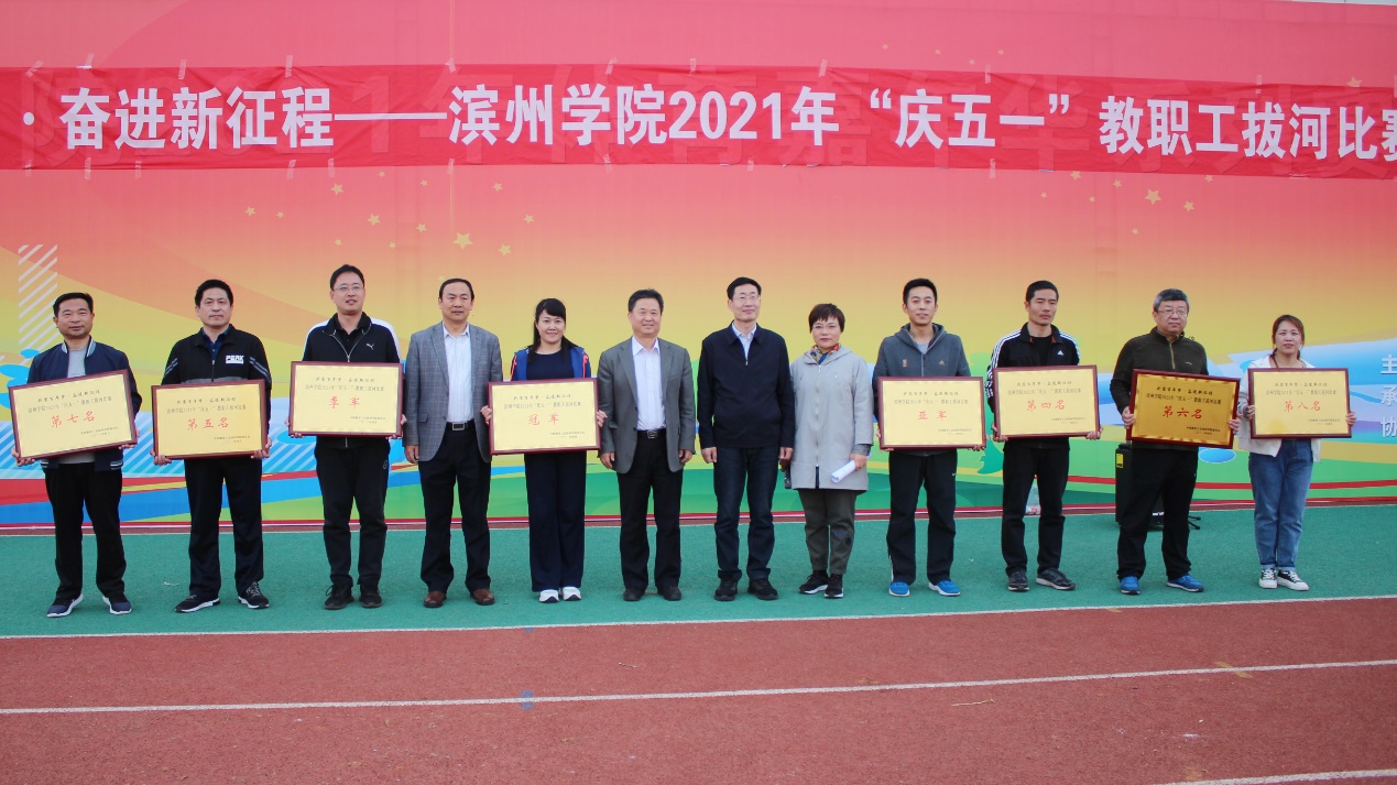 4月27日下午,以“共圆百年梦 奋进新征程”为主题的滨州学院2021年“庆五一”教职工拔河比赛在学校田径场成功举行。学校党委委员、副校长孙银河出席活动并为获奖分会颁奖,工会、太阳成集团122ccvip负责人和各基层分会主席参加活动,来自23个基层分会的近500名教职工参加了比赛。