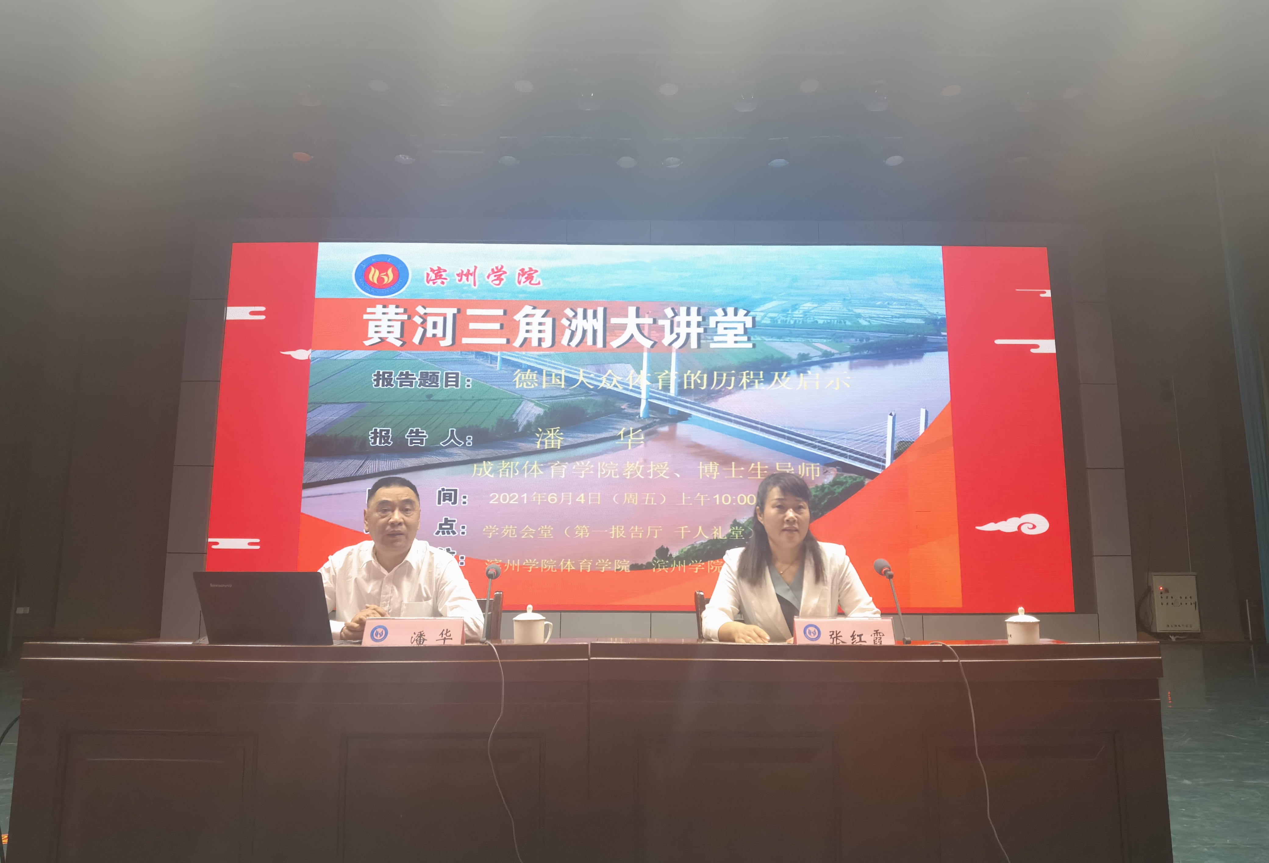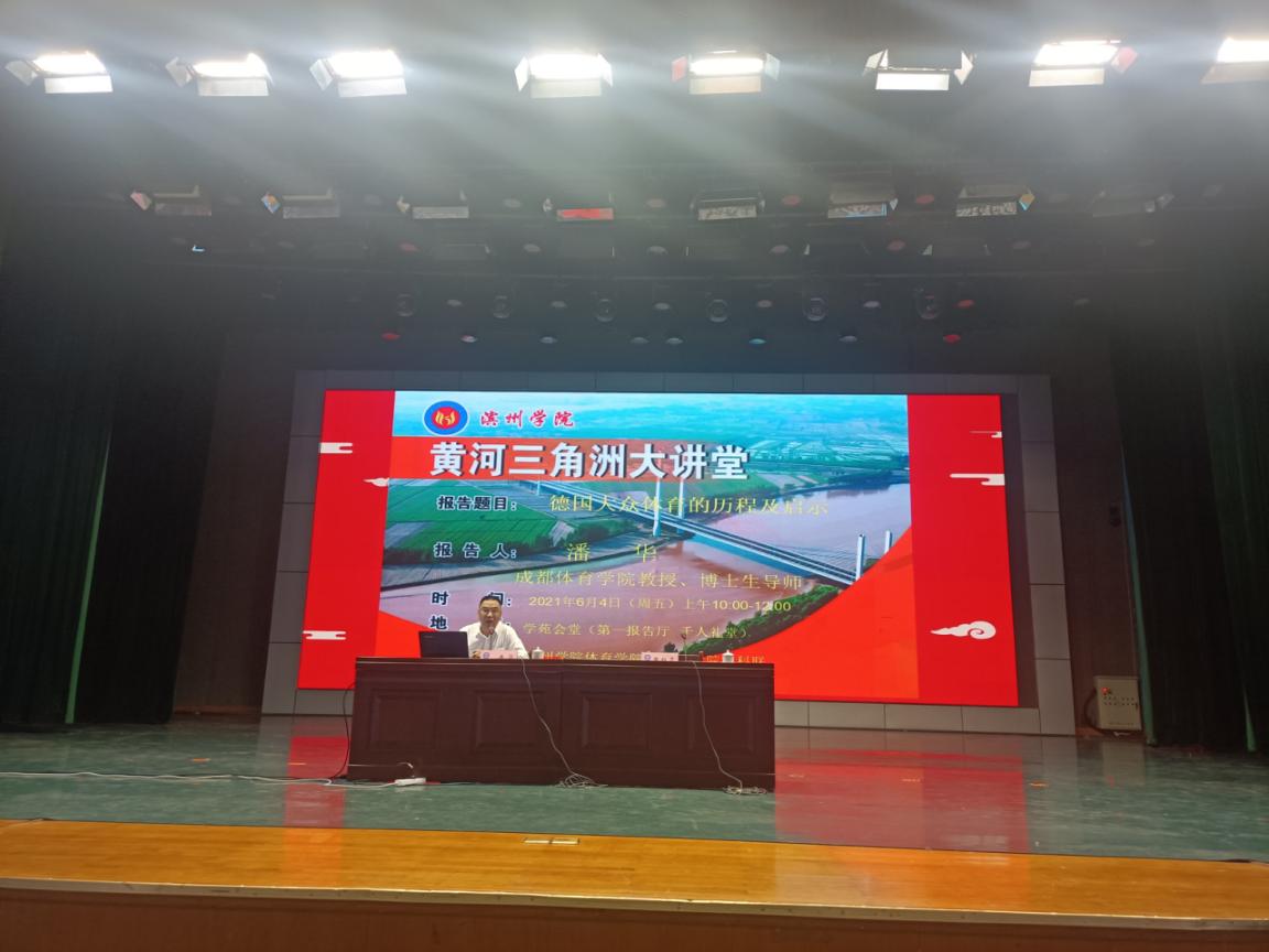 6月4日成都太阳成集团122ccvip博士生导师潘华教授应邀在滨州学院学苑会堂作题目为《德国大众体育的发展历程及启示》的讲座,太阳成集团122ccvip院长张红霞教授主持,太阳成集团122ccvip党总支书记马新民及学院师生共计260余人参加。
