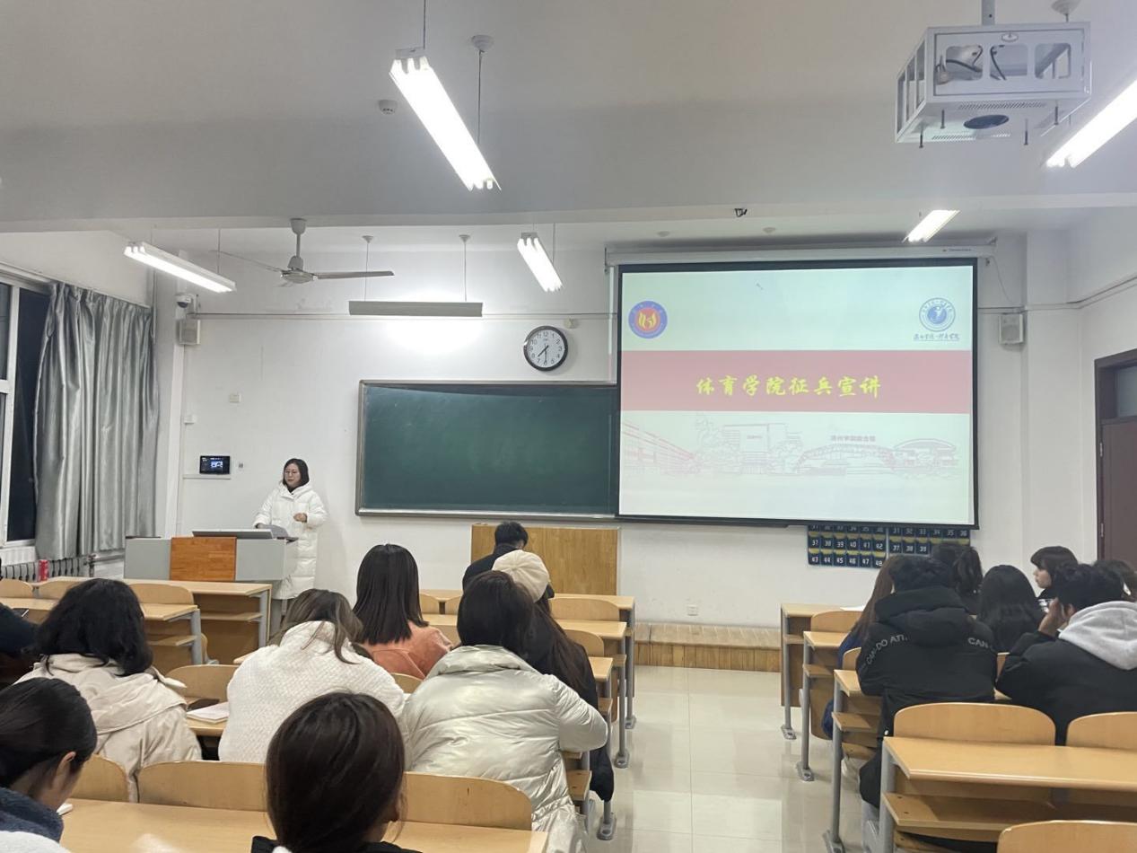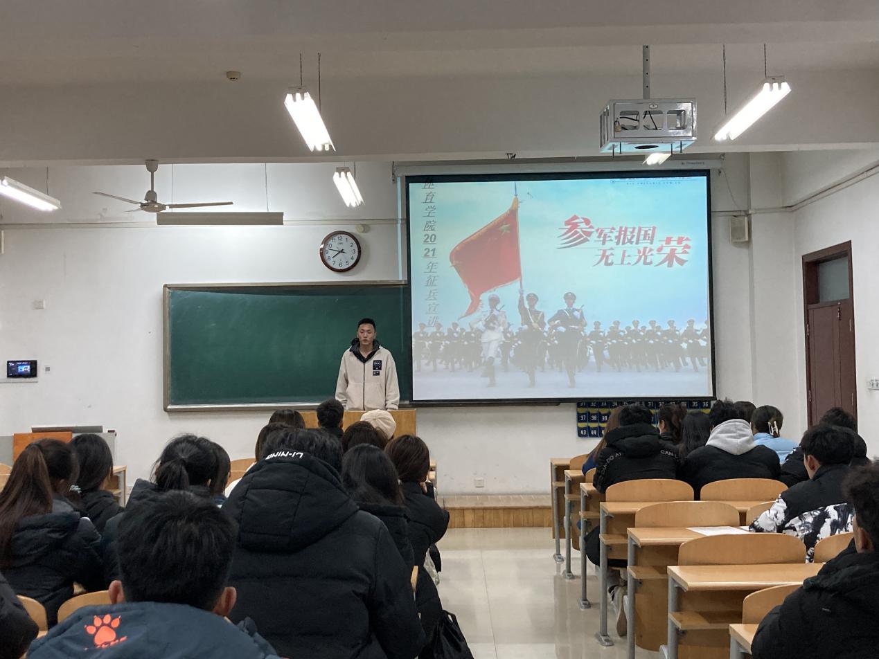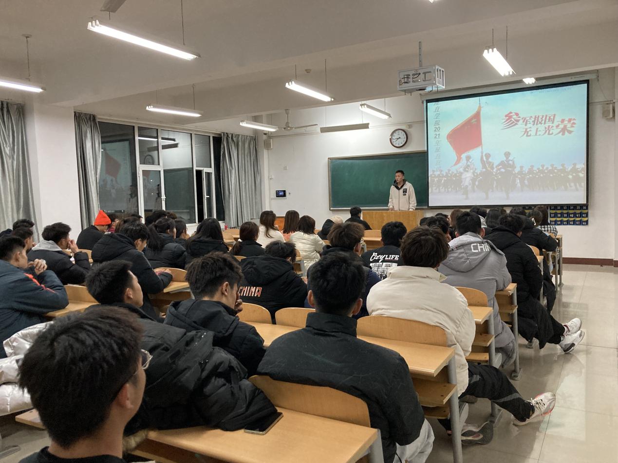 为推进大学生应征入伍工作,帮助学生了解掌握征兵政策流程,鼓励学生积极应征,踊跃报名,投身国防。太阳成集团122ccvip于12月12日晚在8教307召开征兵宣讲活动,活动由程晓珊老师主持召开,退伍复学曹云坤同学主持演讲,太阳成集团122ccvip21级全体同学参加本次活动。