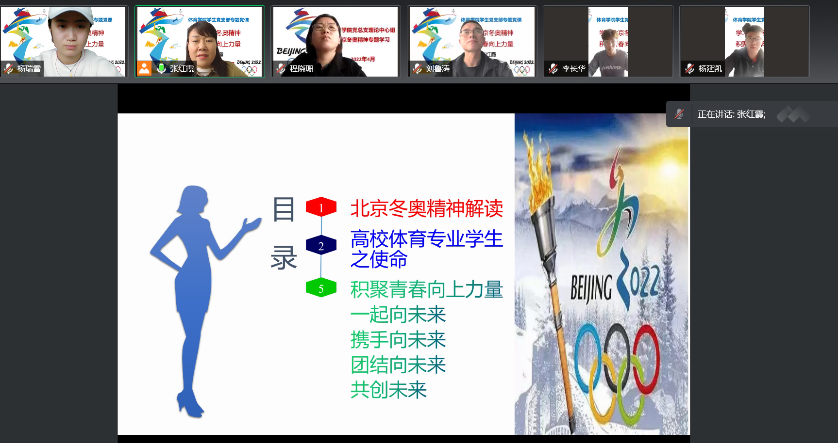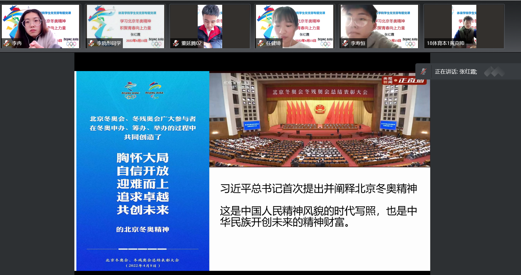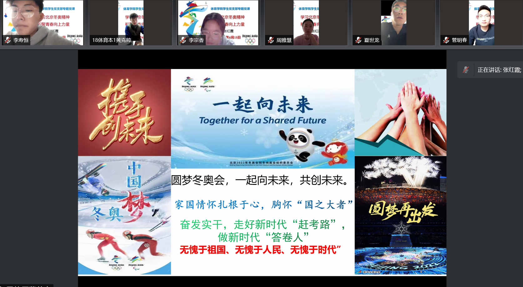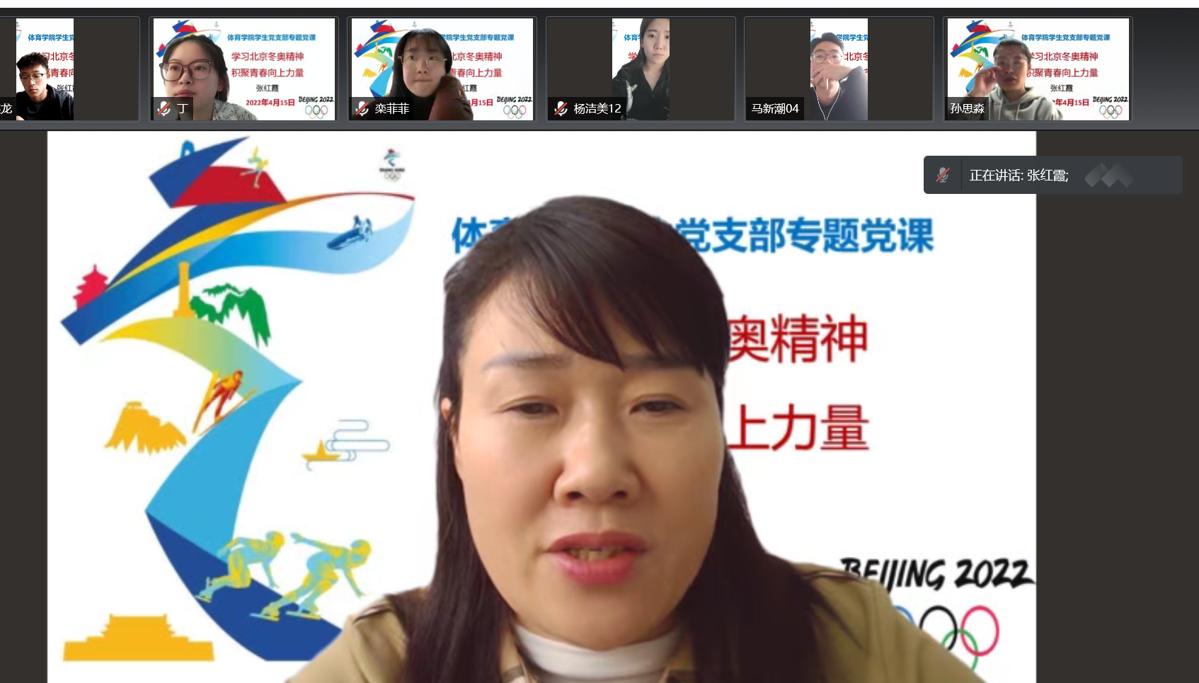 4月15日下午,太阳成集团122ccvip院长、党总支副书记张红霞以“学习北京冬奥精神,积聚青春向上力量”为题为学生党支部的党员们上了一堂生动精彩的专题党课。党课以线上形式召开,学生党支部全体党员参加。