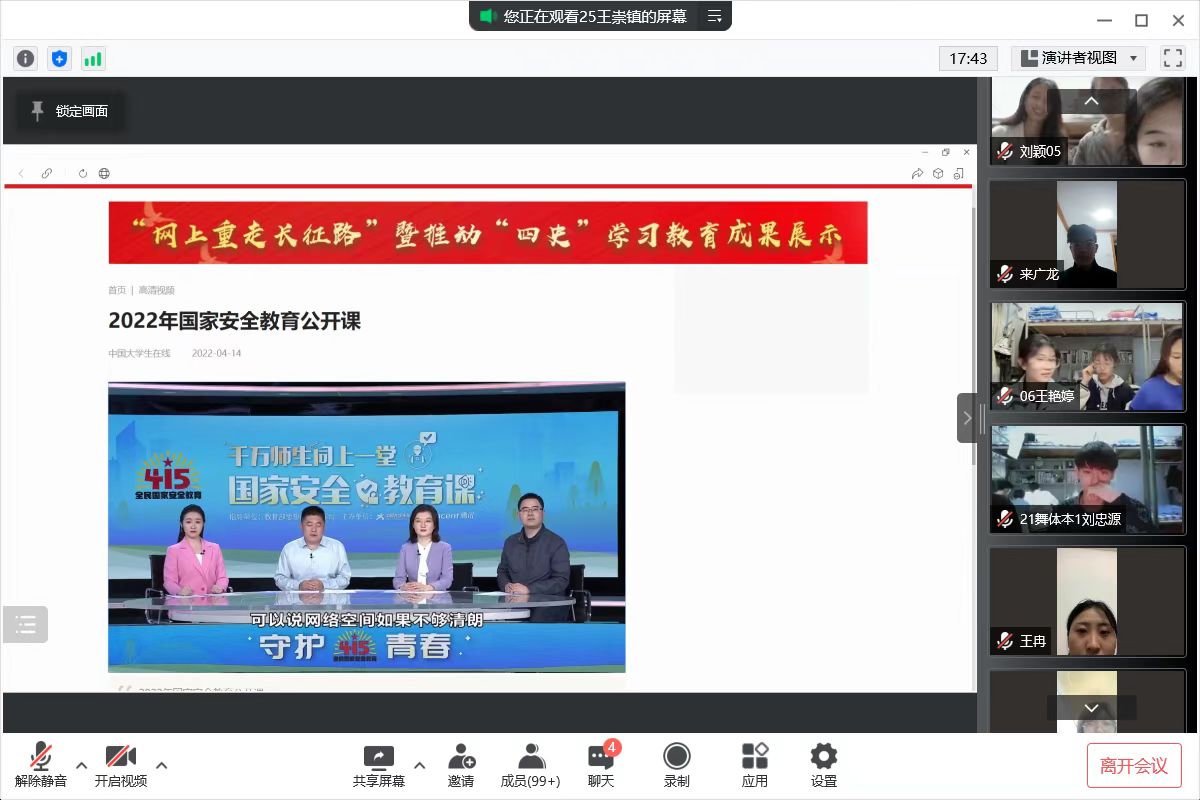 为进一步提高我院师生的国家安全意识,增强国家安全责任,在第七个全民国家安全教育日到来之际,4月16日晚,我院在各班主任的带领下以腾讯视频会议的方式,组织线上观看由教育部思想政治工作司、中国大学生在线、腾讯推出的主题公开课。