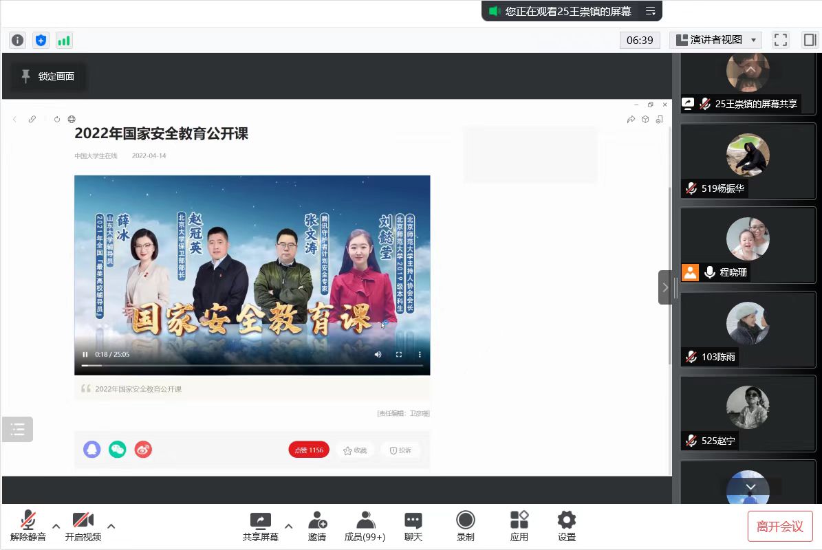 在此次公开课上,北京大学保卫部部长赵冠英、腾讯守护者计划安全专家张文涛、2021年“最美高校辅导员”、山东大学辅导员薛冰、北京师范大学2019级毕业生刘懿莹带领大家共话国家安全。公开课深入浅出阐述国家安全的重要意义、当前国家安全的总体形势、如何维护国家安全等,以生动真实的案例向我们展现正确维护国家安全的行为示范,教育引导国家安全的正确行为示范。看完本次公开课后,同学们进行了热烈的讨论,并通过召开班级研讨会进行线上讨论,与班主任分享心得体会畅谈学习收获。