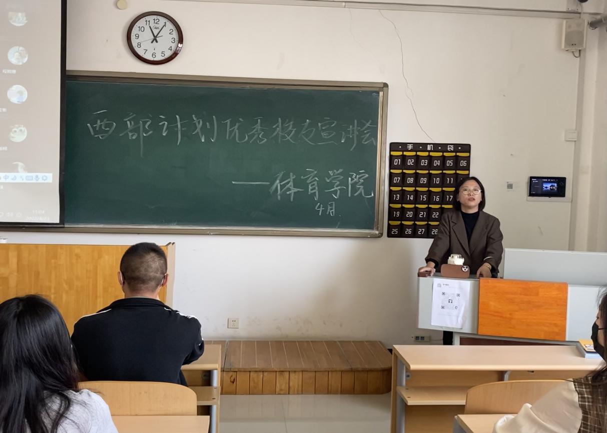 会上,程晓珊首先向学院毕业生们详细介绍了“西部计划”的内涵、七个专项内容、志愿者服务的意义以及报名招募的流程,并围绕选拔程序、毕业后档案存放、服务期限、优惠政策、服务期满后的发展等学生主要关注的问题进行了解读。