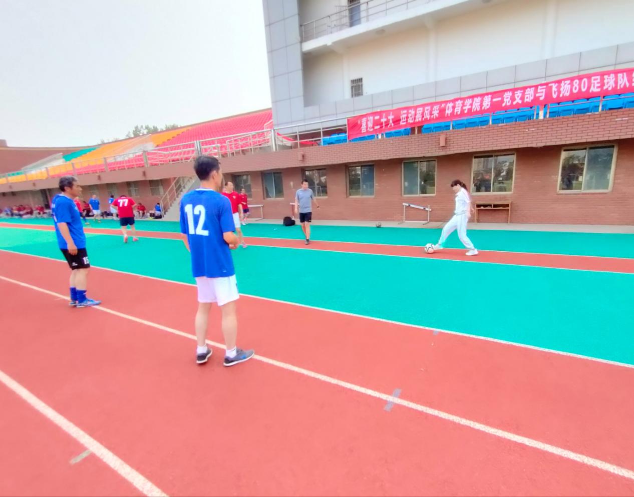 活动伊始,教工第一党支部的党员和飞扬80足球队运动员们围绕如何服务地方足球事业发展、如何发挥党员在体育竞技比赛中的模范带头作用等内容展开互动、交流。教工第一党支部书记刘林星说道,“飞扬80足球队多年来致力于服务地方足球事业发展,展现出积极向上、勇于拼搏的良好风貌,我们将以此次活动为契机,以党建为引领,紧紧围绕如何提高体育竞技水平、促进地方体育事业发展方面,做好结合文章,凝聚合力,助推体育强国建设。”随后,大家在滨州学院田径场举行了足球友谊赛。绿茵场上,双方队员精神抖擞、斗志昂扬。积极的跑位、默契的配合、出色的防守、精彩的射门,展示出了运动员们良好的竞技状态,让在场每一个人感受到了足球运动带来的快乐。