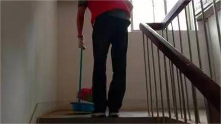 图为志愿者在山东省滨州市滨城区孙家馨苑负责清扫小区楼道垃圾,抹清小区扶手。