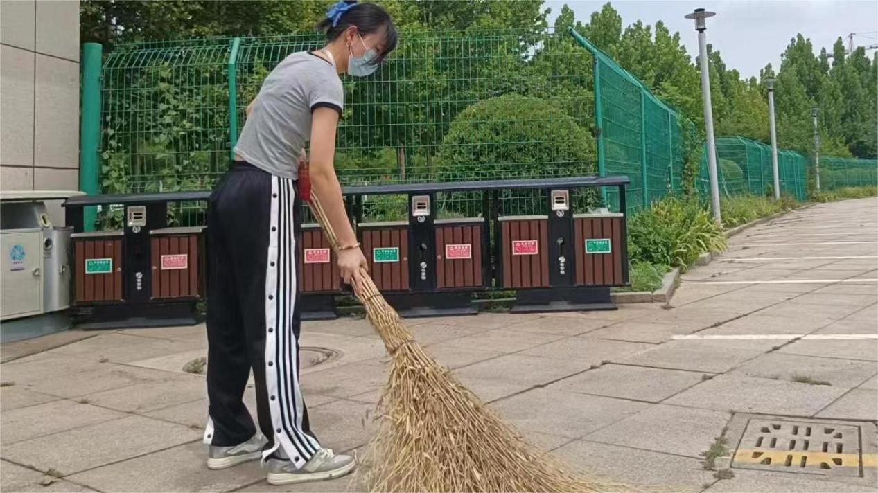 图为志愿者在山东省东营市河口区参加社区清扫活动。暑假任务主要是负责小区卫生,规整小区风貌。
