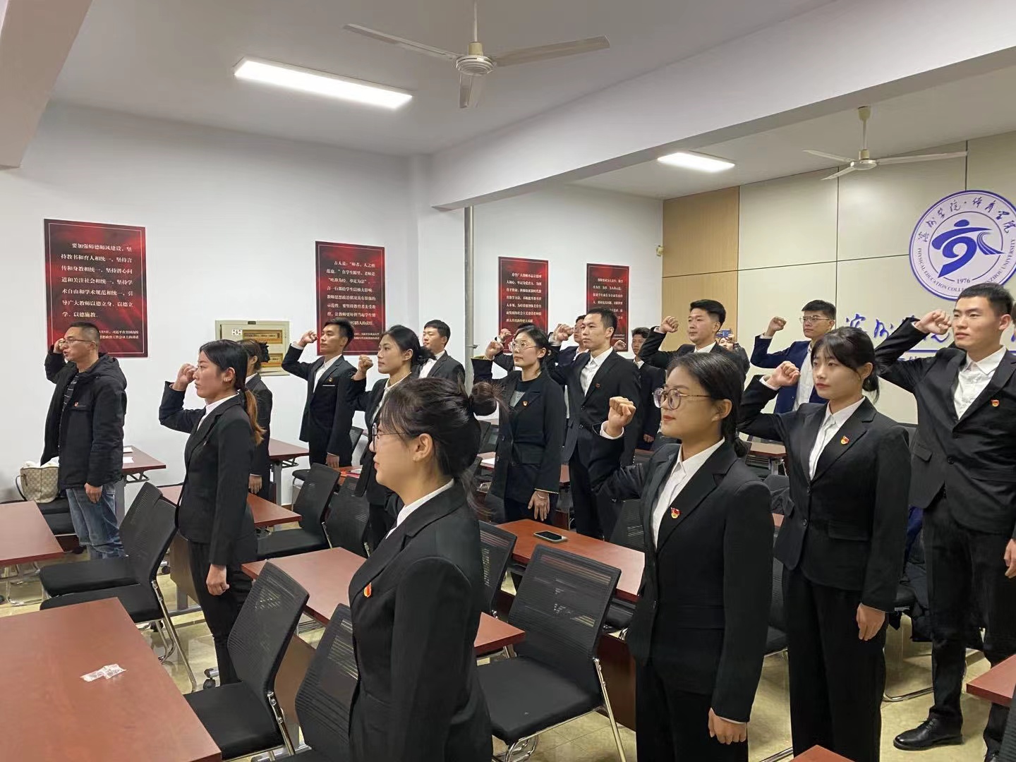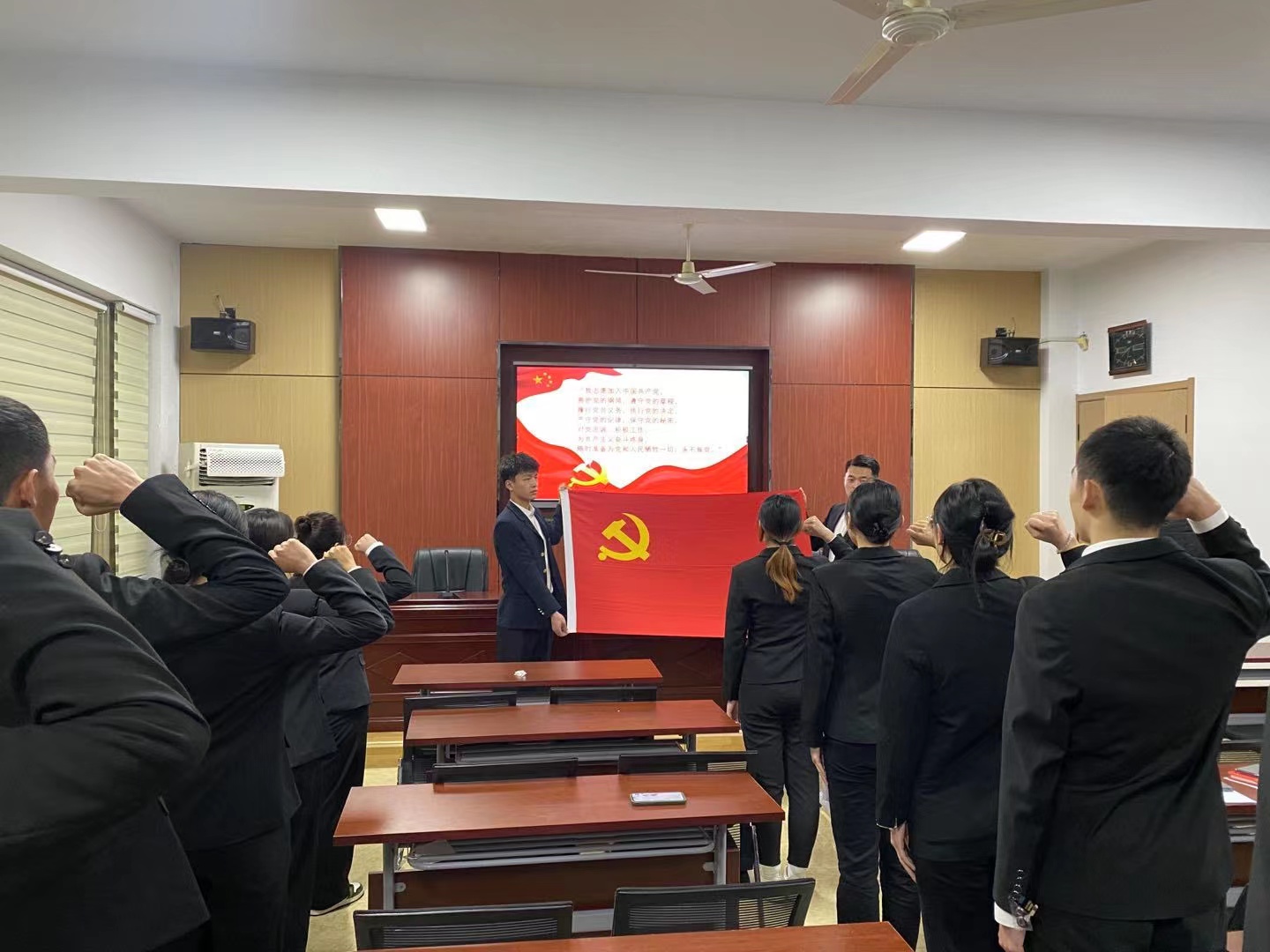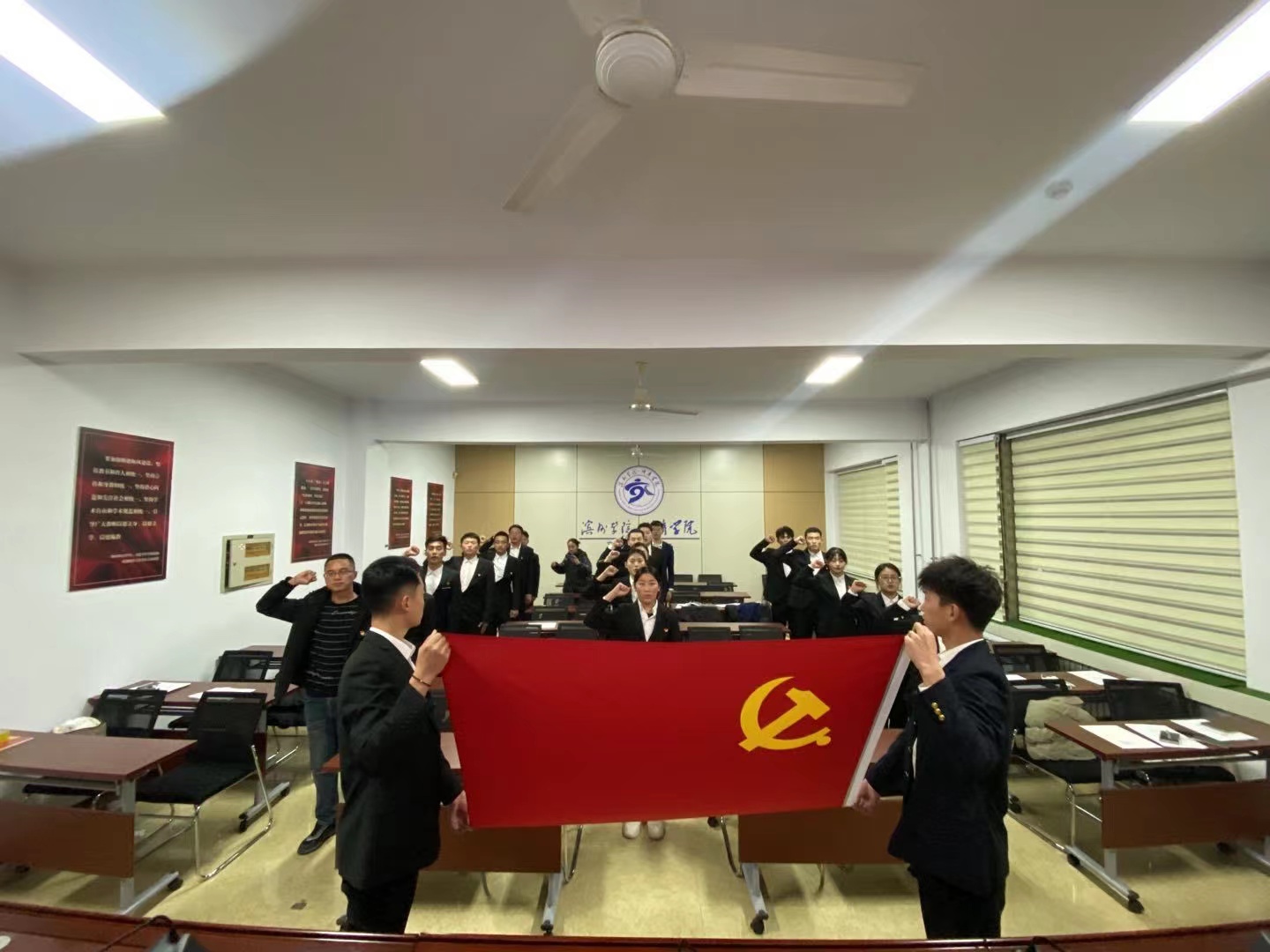 会议严格按照党组织接收预备党员程序进行,党支部书刘鲁涛同志宣布本次大会的主要内容是讨论接收于明召等16名发展对象为预备党员。于明召等16名发展对象逐一宣读《入党志愿书》,并向党组织汇报自身对党的认识、入党动机、本人履历、家庭和主要社会关系、以及在校表现等情况,表明自己的态度,表达了入党的决心和强烈愿望。入党介绍人向大会介绍16名发展对象在政治、思想、学习、工作、生活等方面的情况。程晓珊同志向大会报告其现实表现的考察情况以及综合政治审查情况,经审查,于明召等16名发展对象历史及家庭关系清白,符合预备党员的条件。经与会正式党员无记名投票表决,大会一致同意接收于明召等16名同志成为中共预备党员。党支部书记刘鲁涛同志要求各位预备党员继续认真学习党的政治理论,加强对党的认识,牢记入党誓词并端正自身入党动机。最后,全体新发展党员面向党旗进行庄严宣誓。