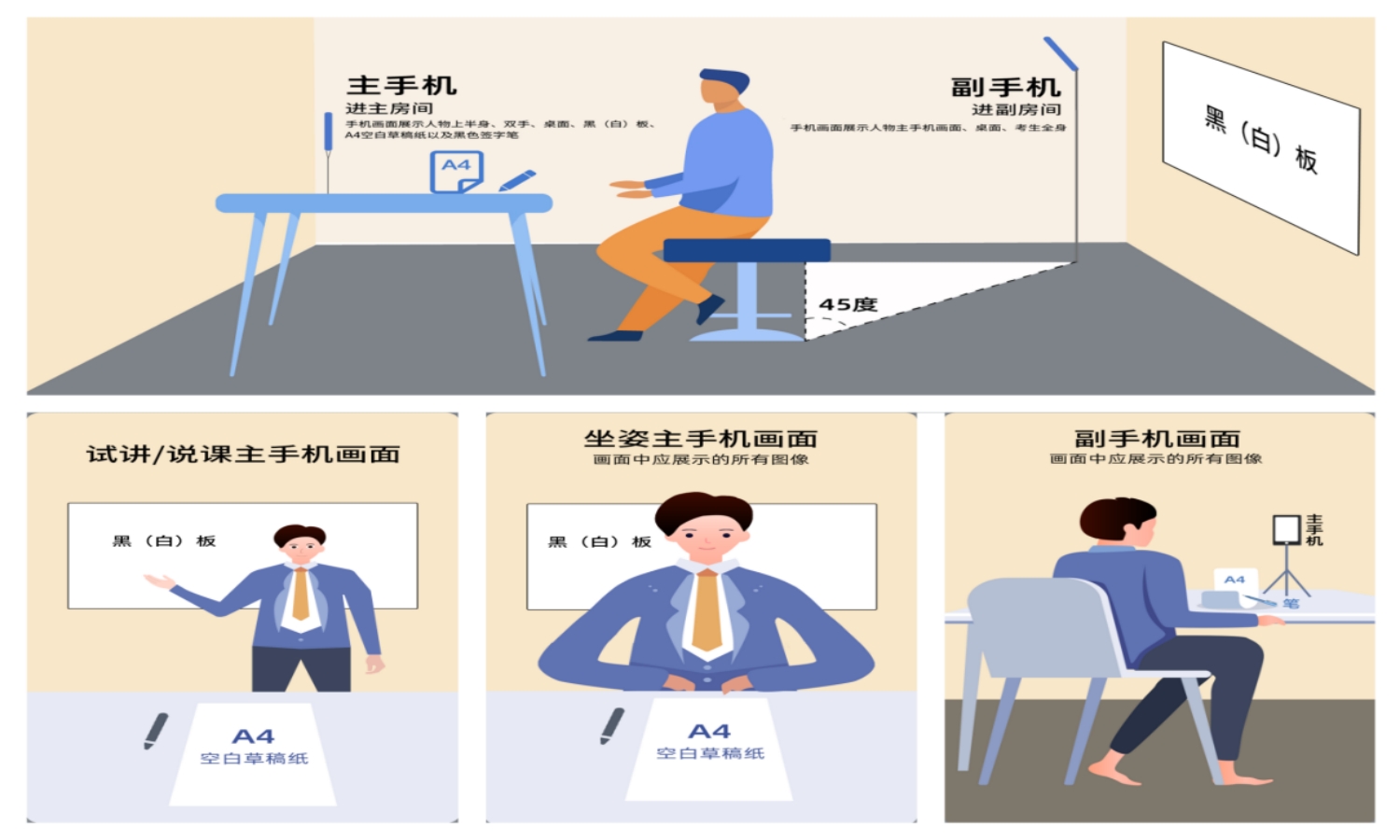(三)为保证画面平稳和角度准确,须固定手机位置进行拍摄,应聘人员可提前使用手机相机摄像模式对照调整本人与手机间的距离和角度。拍摄时主手机应确保应聘人员上半身、双手、桌面和黑(白)板均处于视频画面范围内,副手机应确保主手机的画面、桌面、应聘人员全身均处于视频画面范围内。