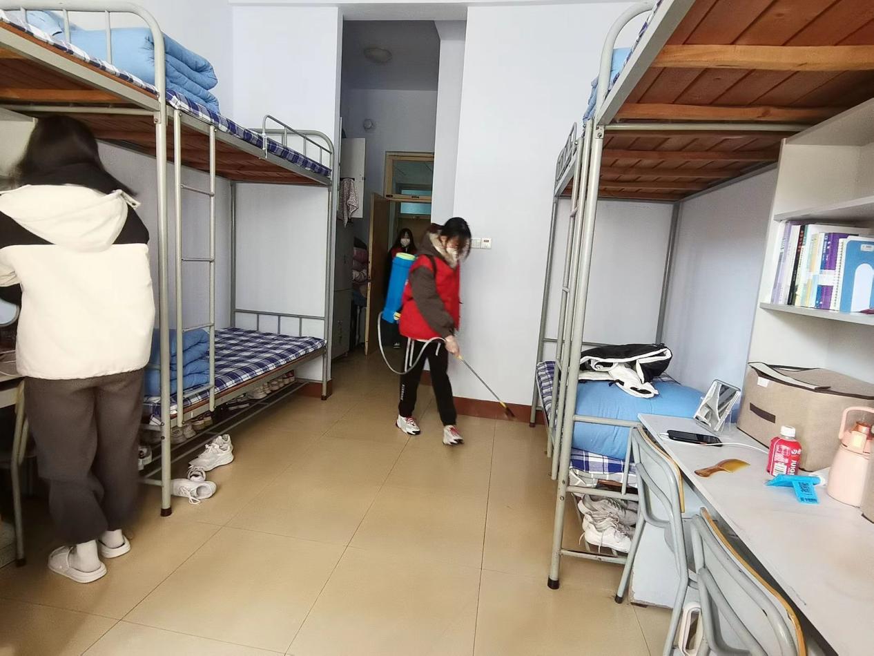 春季是传染病的高发期,学生社区又是居住密度较大的易感区域,为有效降低和控制病毒传播,保障同学们的健康,学生党支部40余名党员在学生公寓开展全面消杀志愿服务。学生党员穿上红马甲,带上口罩,背起喷雾器,对每一个学生宿舍逐一进行全面清洁消毒,开窗通风换气。地面、阳台、卫生间、洗手池、门把手、水龙头开关、床底等区域做到不留死角、不留盲区,同时还提醒同学们注意日常的宿舍清洁和通风消毒。此外,学生党支部两位老师还面向学生公寓各楼层负责人开展了运动健康教育活动,宣传传染病预防知识、运动保健知识和学生社区日常工作要求等,切实提高了同学们的健康安全意识。同学们也积极配合消杀工作,保证了本次活动的顺利完成。