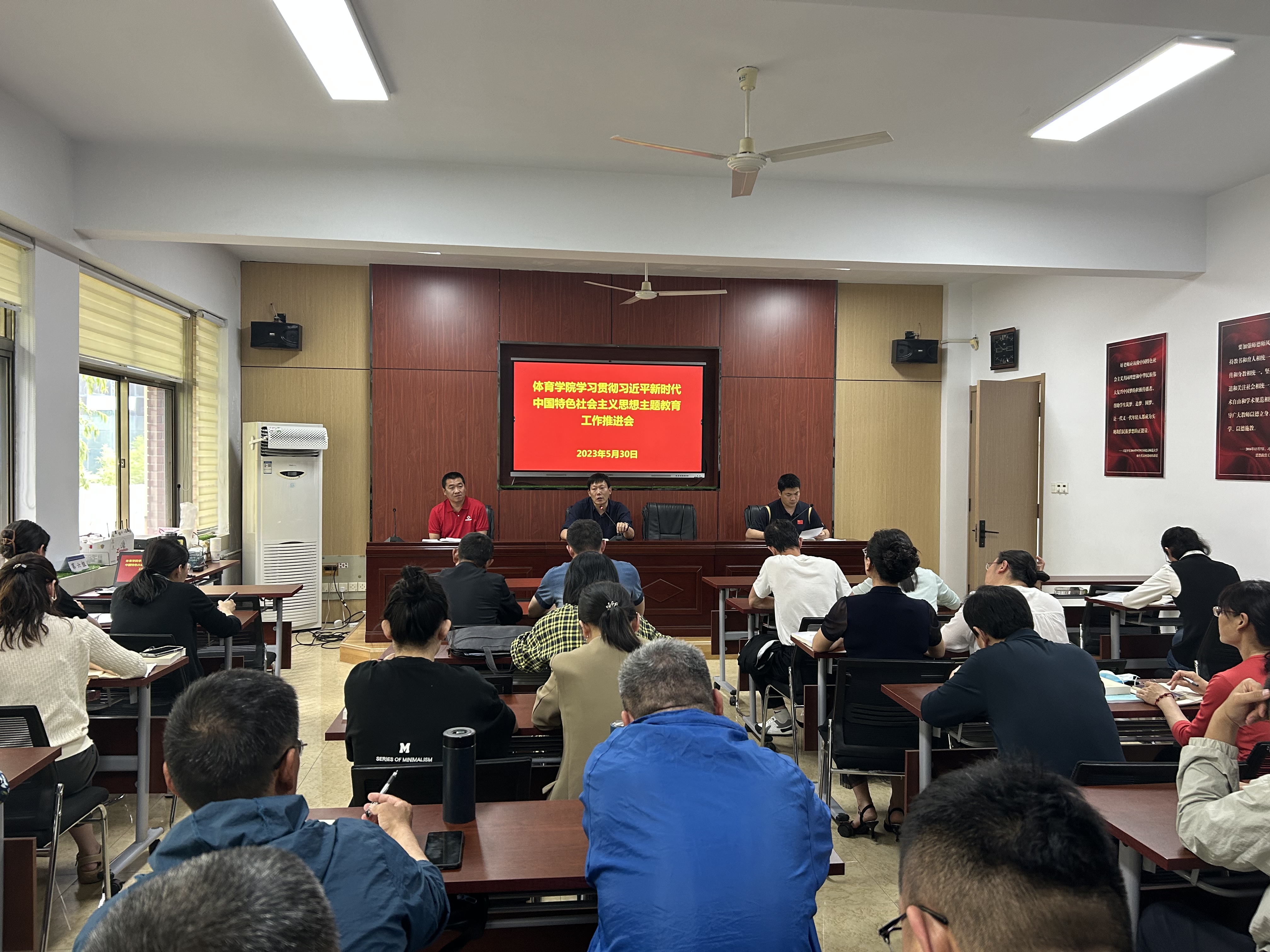 会上,与会人员集体学习了《习近平总书记在教育文化卫生体育领域专家代表座谈会上的重要讲话》《习近平:开创我国体育事业发展新局面加快把我国建设成为体育强国》《习近平:正确把握推进健康中国建设的重大问题》《习近平:培养德智体美劳全面发展的社会主义建设者和接班人》等内容,学习传达了学校《关于在主题教育中抓紧抓实个人自学的通知》等文件通知。