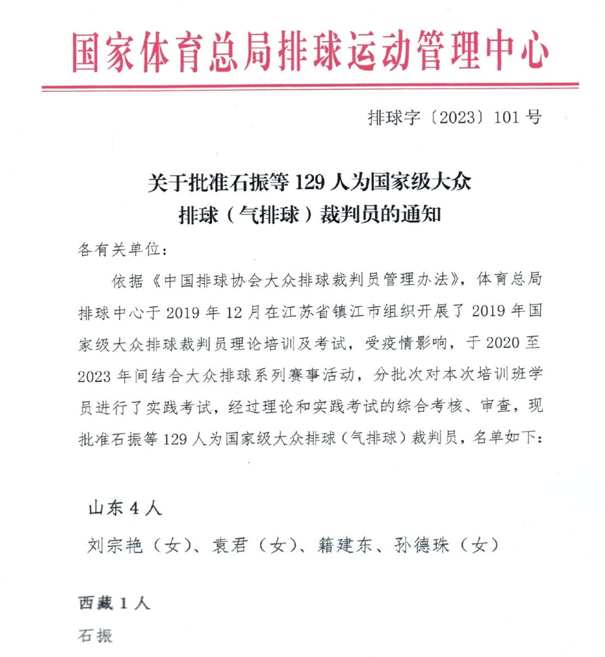近日,中国排球协会官方网站公布,我院教师籍建东晋升为国家级大众排球(气排球)裁判员。在本次公布的129人名单中,我校校友西藏石振同在晋升之列,石振是我院体育教育专业2008级学生。此次师生共同晋升为国家级裁判,是我院长期以来高度重视师生专业技能培养的重要体现。