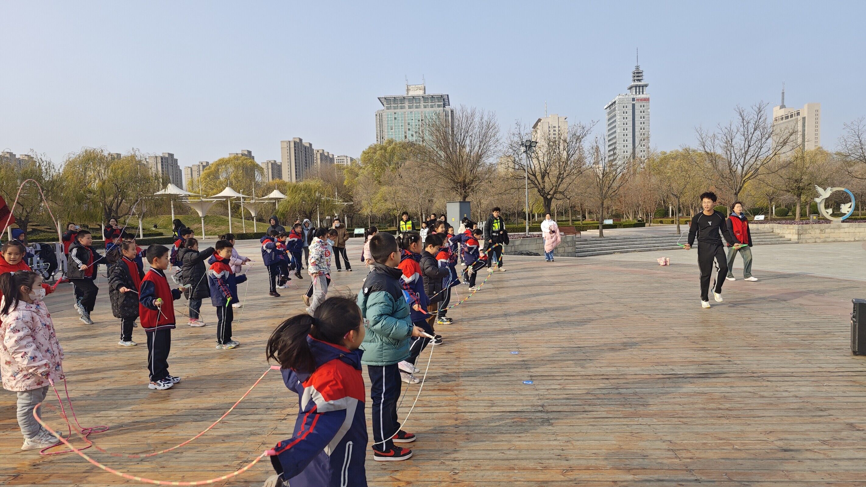 志愿者首先向小学生们介绍了“一·二”九运动的历史背景和意义,接下来奏唱国歌,向革命先烈表达缅怀、敬仰之情,教育引导小学生铭记历史,坚定理想信念,树立远大理想。赛前热身环节,由滨州学院科技体育社团的队员带来了精彩的花样跳绳表演,并教授他们简单的花样跳绳动作。热身结束后,科技体育社团指导老师朱春明带领学生们学习定向运动的识图、用图知识以及比赛规则。