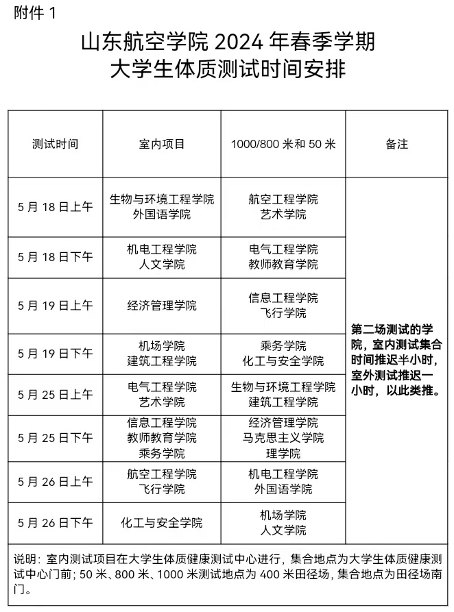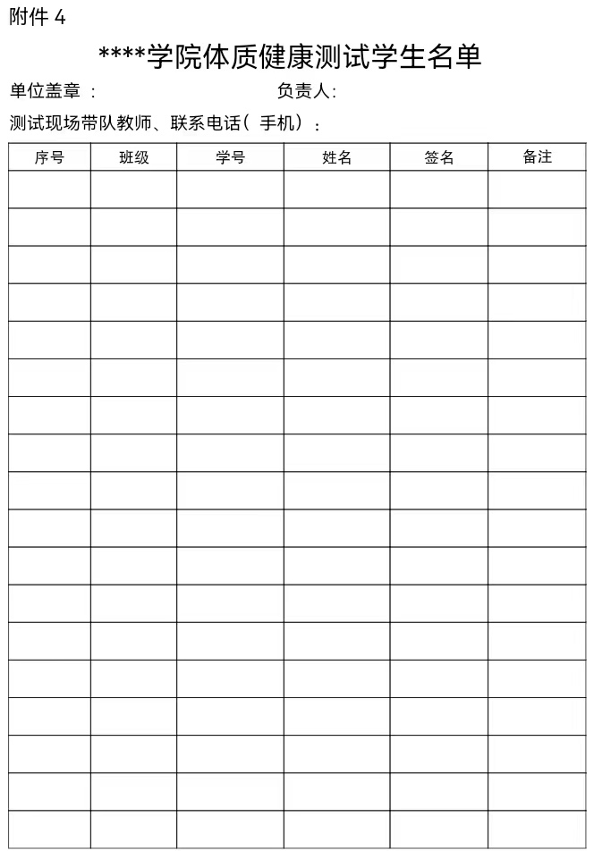 4.请按所在学院时间安排并进行测试签名确认后方可进行测试,测试时必须穿着运动服装和运动鞋参加测试,严格遵守测试安排时间,提前15分钟到场,不得无故不参加、迟到、早退,无故不按时参加测试的学生不再另行安排测试,测试成绩以零分计。