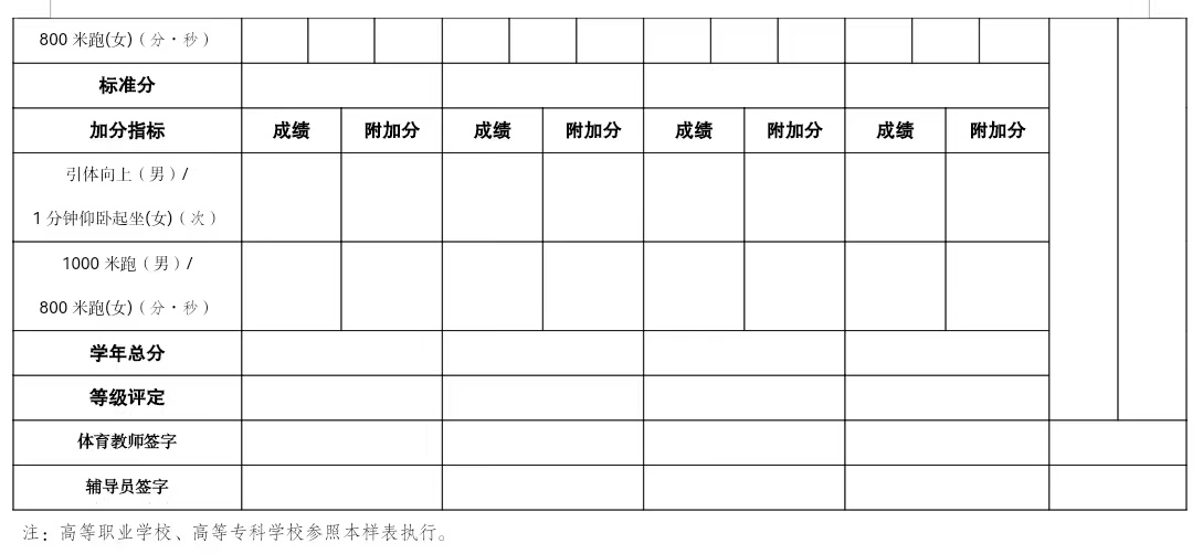 8.每个学生每学年评定一次,记入《〈国家学生体质健康标准〉登记卡》。特殊学制的学校,在填写登记卡时可以按规定和需求相应地增减栏目。学生毕业时的成绩和等级,按毕业当年学年总分的50%与其他学年总分平均得分的50%之和进行评定。