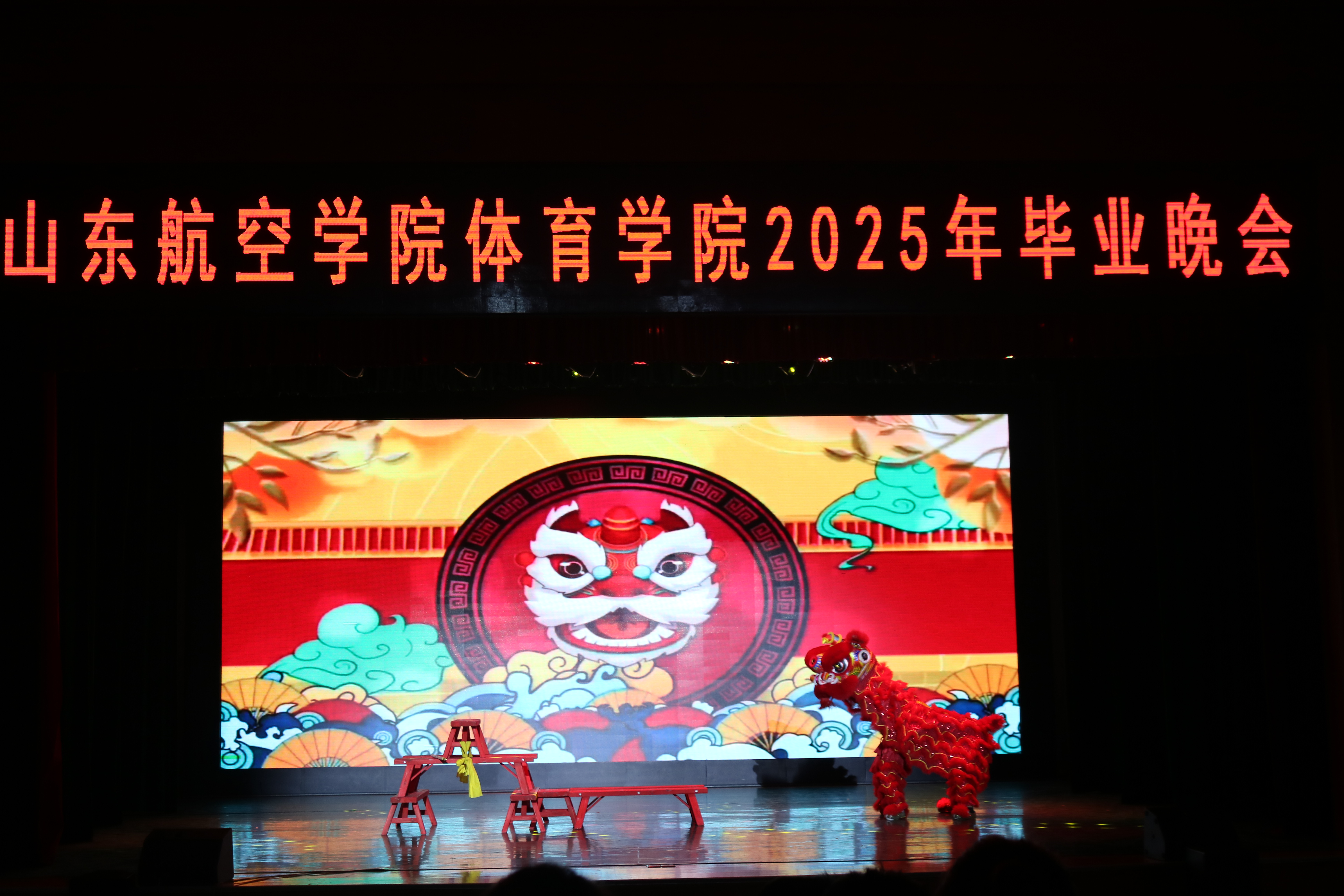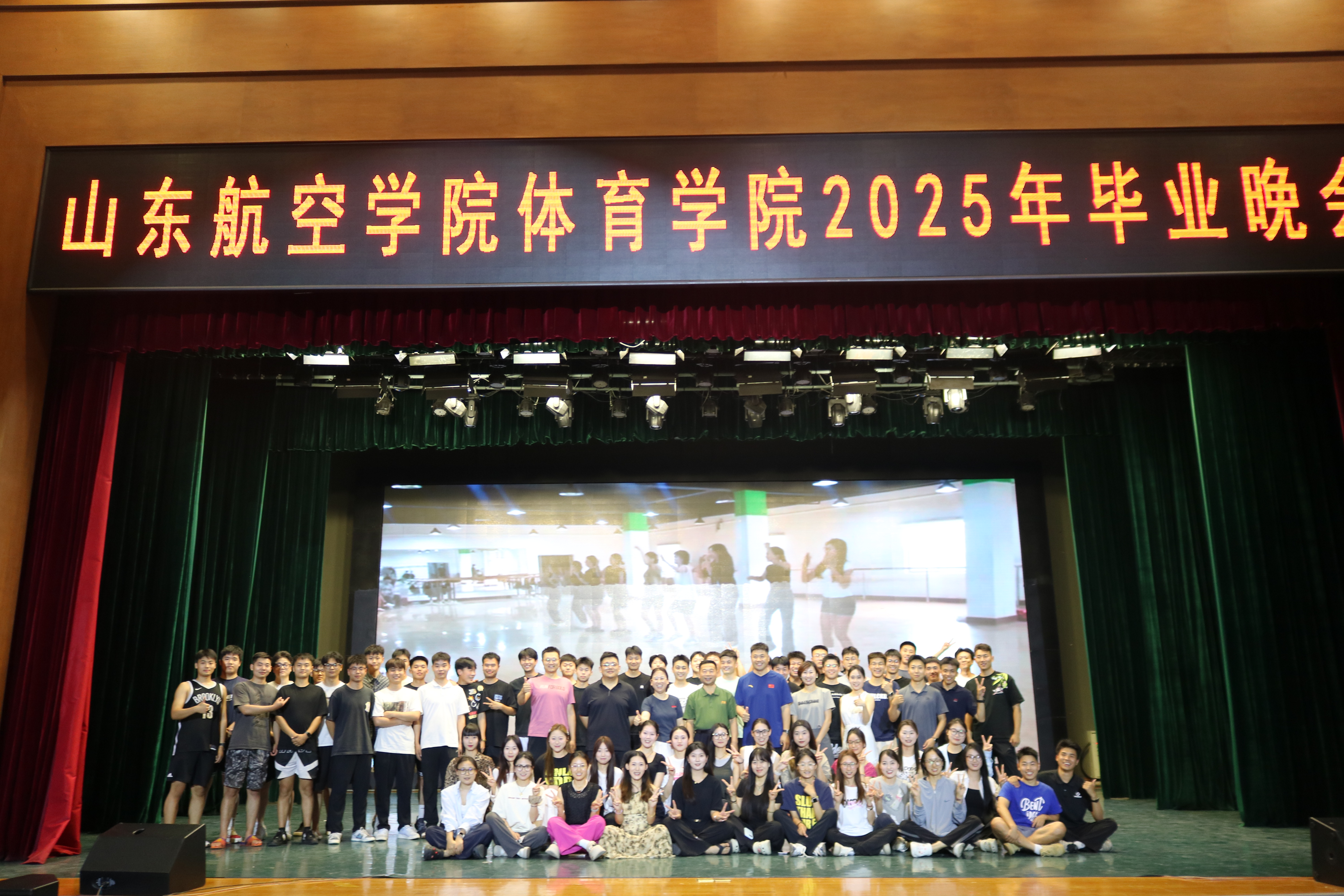 晚会在气势恢宏的《八仙送福·狮跃前程》舞龙舞狮表演中震撼开场,精湛技艺与热烈氛围瞬间点燃全场。随后,幽默风趣的小品、清脆悦耳的歌声、技巧高超的花样跳绳等节目轮番登场,精彩纷呈。其中,由2024体育本2的王德水等同学献演的武术节目尤为引人注目,刚劲有力的招式淋漓尽致地展现了中华传统武术的独特魅力。俏皮活泼、婀娜多姿的舞蹈串烧更是将现场气氛推向高潮。最后,学院领导与全体2025届毕业生合影留念,为这场充满温情的青春盛宴画上圆满句号。晚会特别设置了“青春记忆”环节,大屏幕上播放了2025届毕业生四年来的成长照片,从军训到课堂,从运动会到实习实践,一张张照片勾起了在场师生的美好回忆。当看到入学青涩照片与毕业照的对比时,不少师生热泪盈眶。