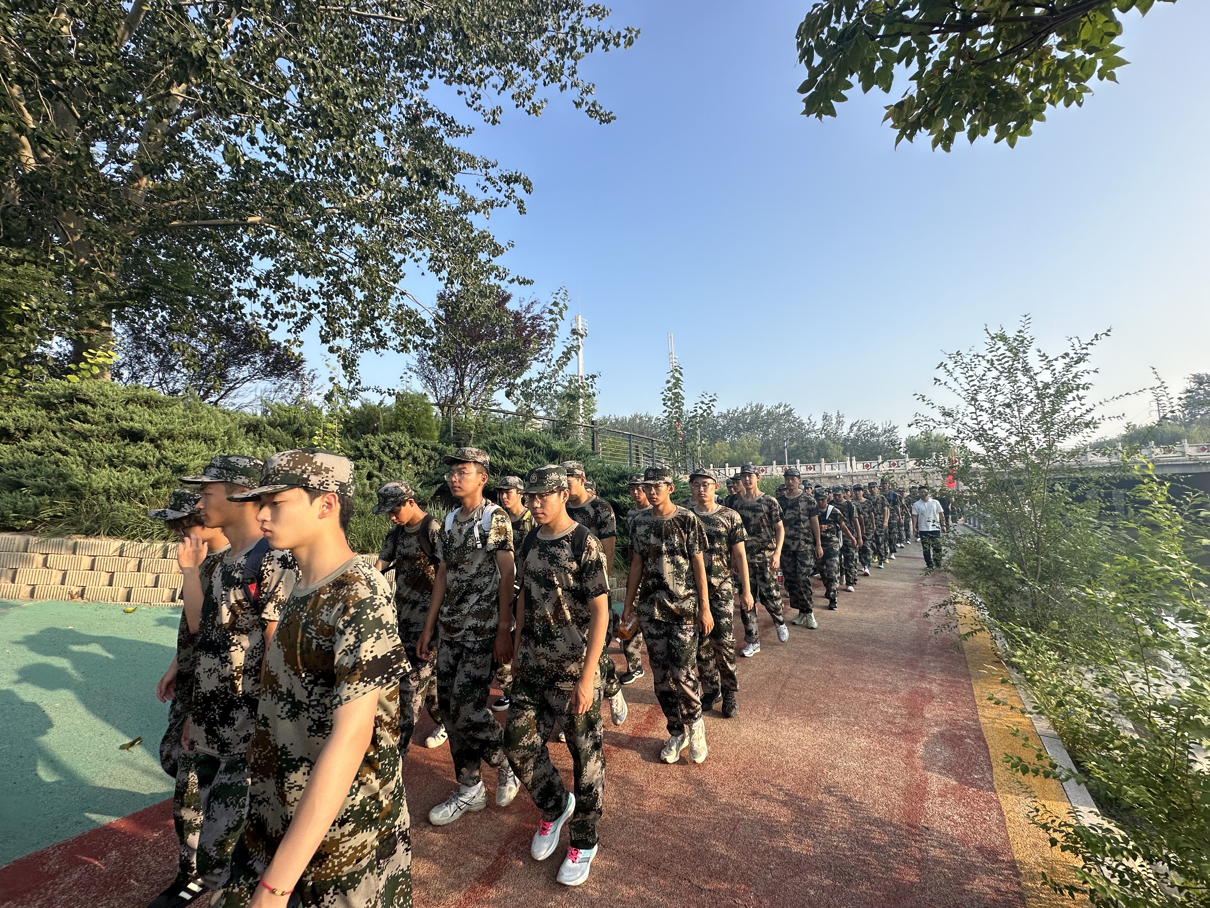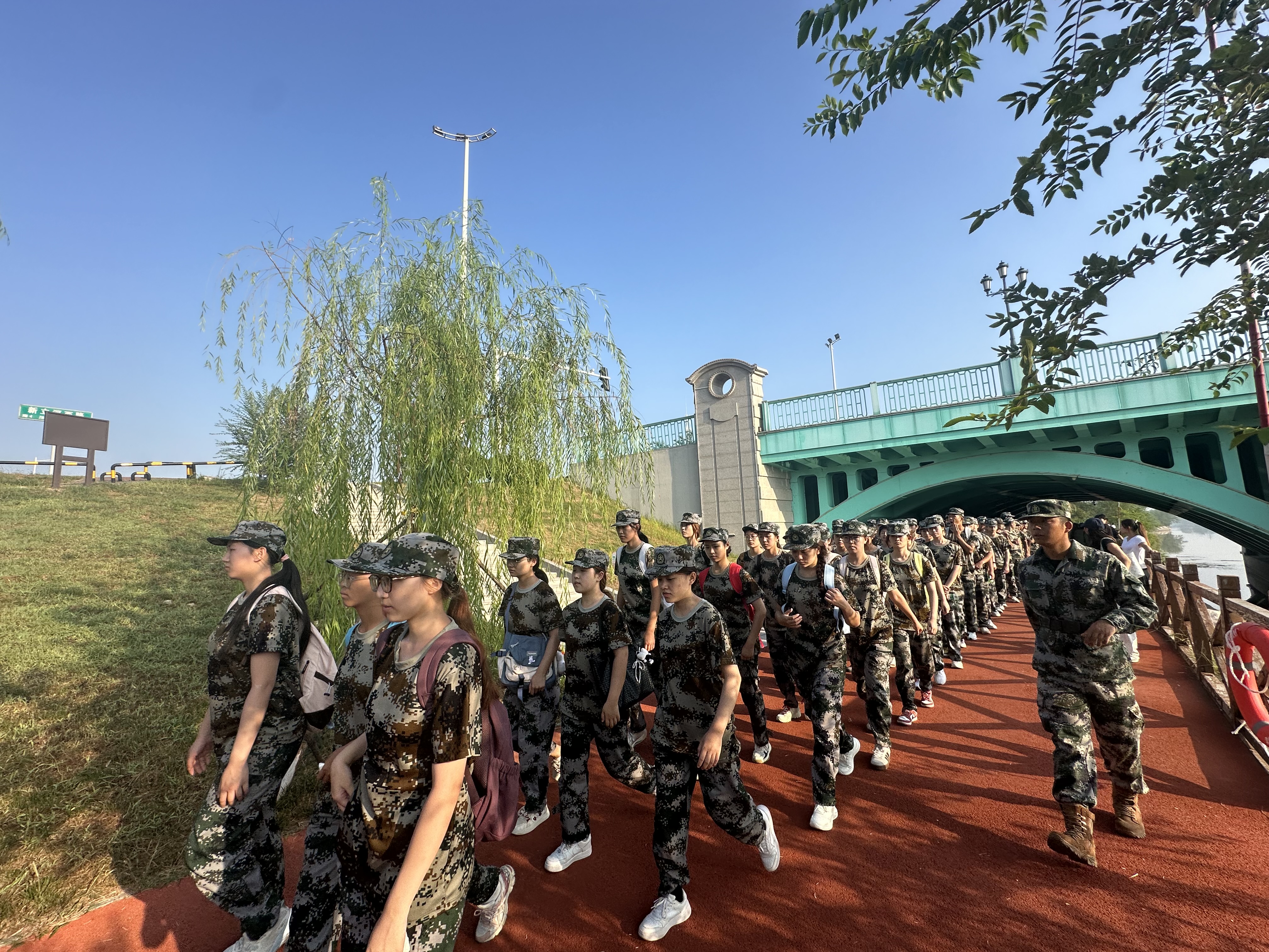 清晨6时30分,晨光初现,参训新生已在田径场整齐列队。身着迷彩的青春脸庞神采奕奕,挺拔的身姿尽显昂扬斗志。随着出发指令下达,拉练正式启程。同学们高举连旗,保持整齐队形,沿着新立河公园滨河步道有序行进。“一、二、三、四!”嘹亮的口号声在公园上空回荡。行军途中,队伍组织了拉歌比赛,《强军战歌》等铿锵旋律此起彼伏,士气高涨。同学们相互鼓励,携手前进:有人主动接过体力不支同学的背包,有人在一旁加油鼓劲,浓浓的“战友情”在队伍中流淌,生动展现了团队的力量。